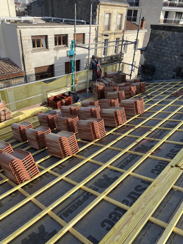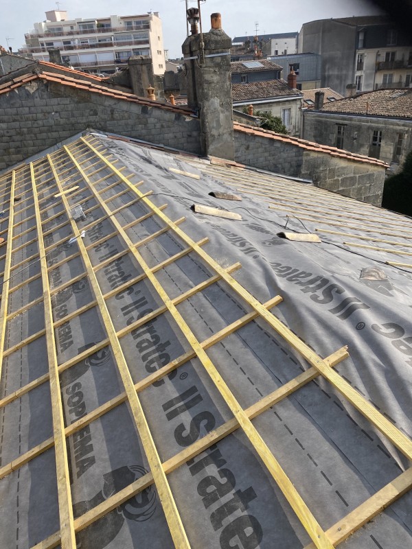 Nous avons posé un écran sous toiture et ensuite des nouveaux liteaux, contre liteaux traités pour éviter que des nuisibles rongent la toiture sachant que dans Le Bouscat il en a beaucoup.